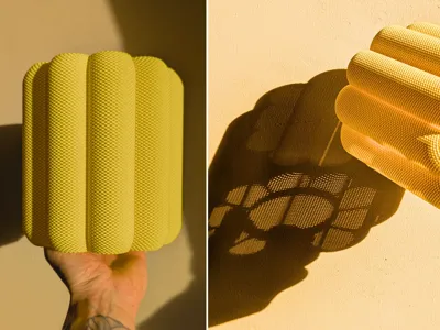 I’ve designed a fresh take on a basket-style lamp featuring elegant, rounded, flower-shaped curves that give it a soft, organic, and modern floral silhouette. The shade boasts a textured, perforated weave pattern that beautifully diffuses warm LED light, creating a cozy, glowing ambiance with delightful petal-like layers (as seen in the left image of your photos).